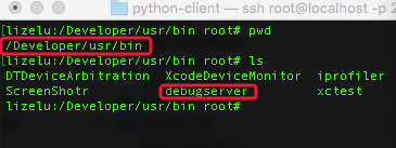 进入到到Mac中debugserver所在的目录下执行上述命令即可,-thin后方填写你的测试机相应的ARM架构即可,因为我的测试机是iPhone 6 Plus, 是arm64的架构,所以此处填的参数是arm64, 如果你的是iPhone5的设备,那么就是armv7s了。