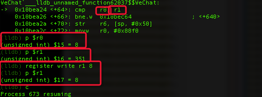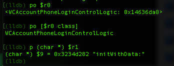 在iOS开发中,我们在使用LLDB调试时,经常会用到po命令来输出某个变量或者常量的值。在使用LLDB调试WeChat时,我们也可以使用某些命令来输出寄存器中的值。我们使用$来访问某个寄存器中的值,并且使用p命令进行打印。下方就是通过p命令将r1寄存器中所存的内容进行打印,在打印之前将$r1进行类型转换,po命令则输出了Objective-C的对象,而p输出的是C语言类型的数据。如下所示: