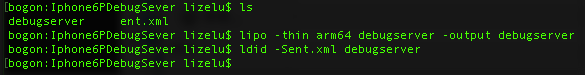 在给debugserver符权限时,我们需要使用到ldid命令,如果你的Mac上没有安装ldid命令,那么请用brew进行install。执行下方的命令行就可以给我们的debugserver赋上task_for_pid权限。需要注意的是-S与ent.xml文件名中是没有空格的。