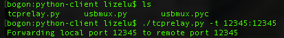 和第一部分中的内容相同,我们使用usbmuxd进行端口的转发,将上述的“12345”端口对接到Mac本地的某个端口,此处我们使用“12345”端口。进入到usbmuxd-1.0.8目录下的python-client下执行下方的命令。