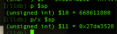 我们还可以将一个地址所存放的值进行打印,下方这个命令就是输出了$sp指针所指的地址处所存放的值: