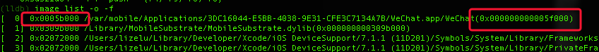 LLDB连接上debugserver后,我们首先使用下方的命令来查看当前进程中的所有模块。从这些输出信息中我们能找到“WeChat”这个进程在虚拟内存相对于模块基地址的偏移量。