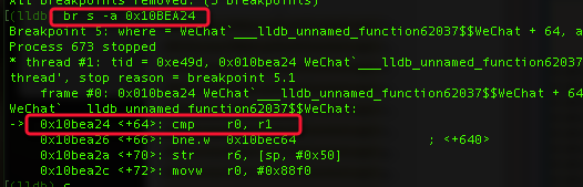 接下来我们要做的就是给0x1063a24 0x5b000 = 0x10BEA24 (cmp)这个内存地址添加断点,然后去修改寄存器r1的值。下方截图就是给0x10BEA24这个内存址添加了断点,并且在输入手机号和密码后,点击登录会执行我们添加的断点,如下所示。在断点出我们清楚的看到了cmp r0, r1这行ARM指令。