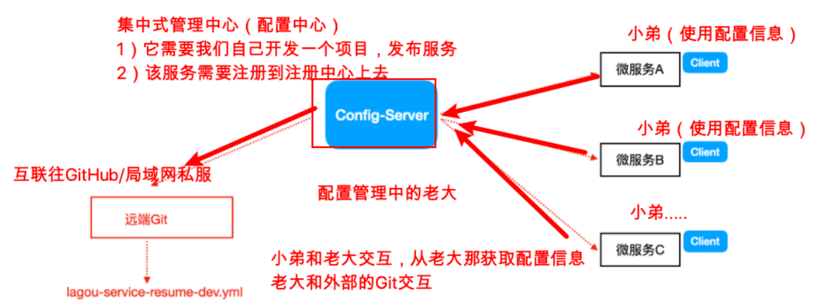 说明:Config Server是集中式的配置服务,用于集中管理应用程序各个环境下的配置。 默认使用Git存储配置文件内容,也可以SVN。