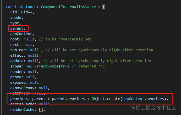 我们通过查看instance对象的源码,可以看到,在instance组件实例对象上,存在parent和provides两个属性。在初始化的时候如果存在父组件则把父组件的provides赋值给当前的组件实例对象的provides,如果没有就创建一个新的对象,并且把应用上下文的provides属性设置为新对象的原型对象上的属性。