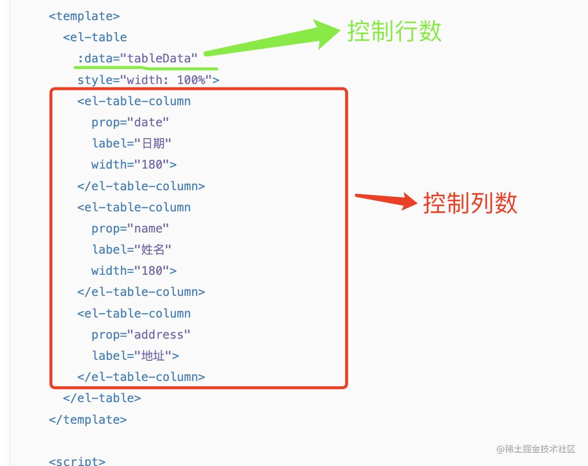 - el-table-column用来控制列数,有几个el-table-column, 表格就有几列