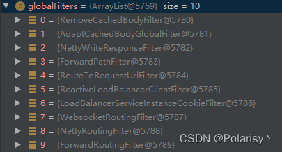 }通过调试可以看到注入所有的GlobalFilter,默认有10个,并初始化