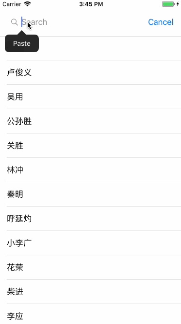 根据 UISearchResultsUpdating 代理方法 - (void)updateSearchResultsForSearchController:(UISearchController *)searchController 来实时获取输入的最新关键字,并遍历数据源,将匹配到的结果显示出来