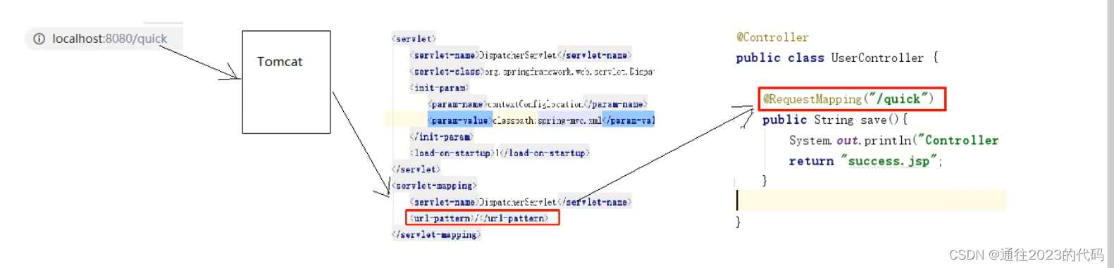 - 然后前端控制器根据输入的url找到对应的Controller映射的“/quick”,从而返回视图