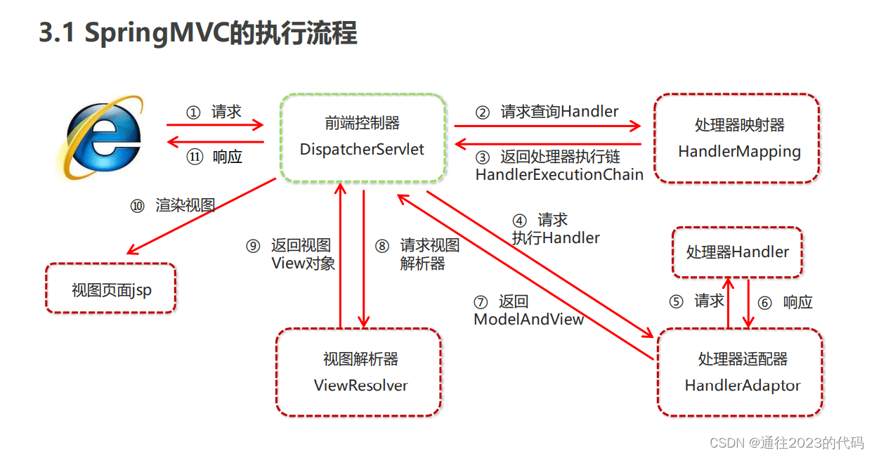 浏览器请求访问某一个资源到视图的展示,并不是靠一个前端控制器来实现的