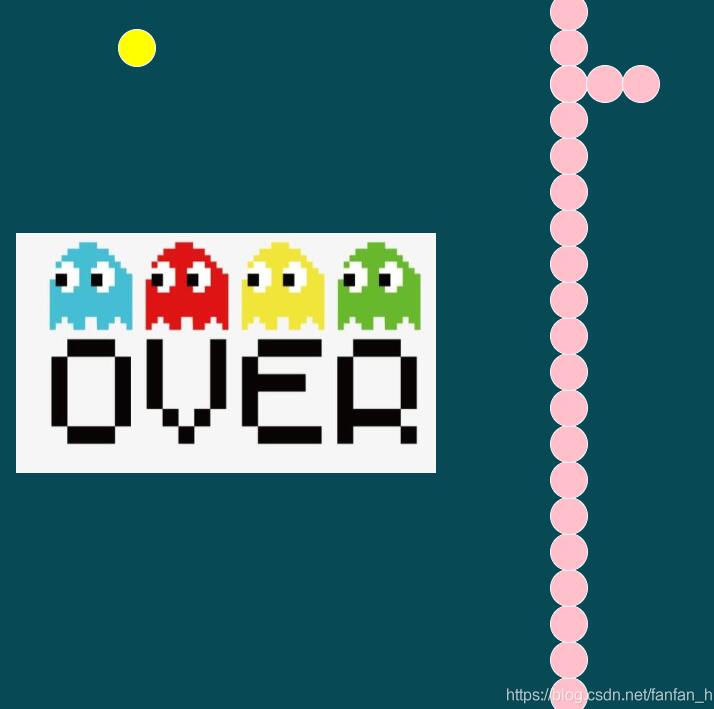 当蛇头的上边距,左边距等于蛇身体某一块的上编剧和左边距时,游戏结束,弹出游戏结束的提示图片