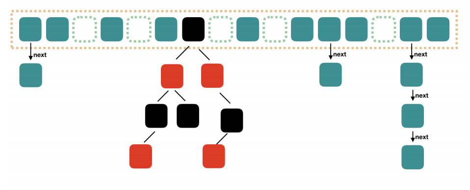 而 JDK8 就不一样了,因为他们的内部很巧妙的给增加了红黑树,如下图