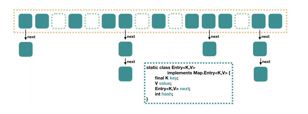 JDK7我们大家也都知道,如果按照横向是数组,那么他的纵向每个元素上面,都是一个单向的链表,而横向上,每一个实体,就相当于是一个 Entry 的实例。