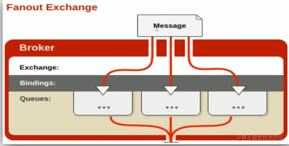 Fanout Exchange 模式不处理路由键,只需要简单的将队列绑定到交换机上发送到交换机的消息都会被转发到与该交换机绑定的所有队列上。因此Fanout交换机转发消息是最快的。