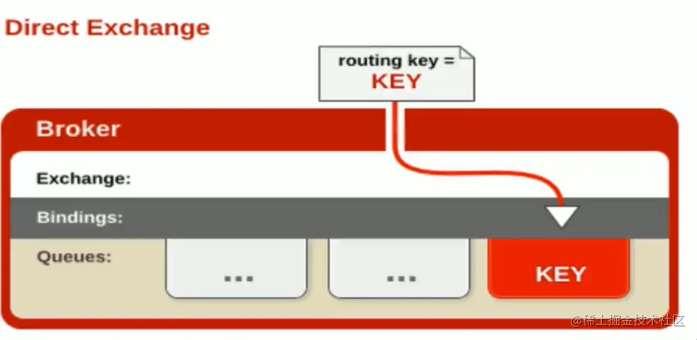 Rabbit的Direct Exchange模式是指消息发送导RouteKey中指定的Queue,Direct模式可以使用Rabbit自带的Exchange,所以不需要将Exchange进行任何绑定。消息传递时,RouteKey必须完全匹配,消息才会被队列接收,否则消息将会被抛弃。