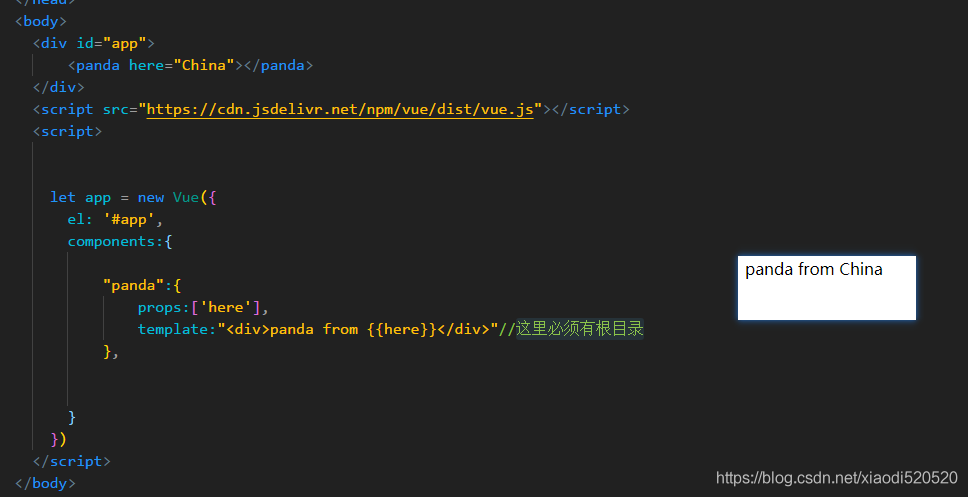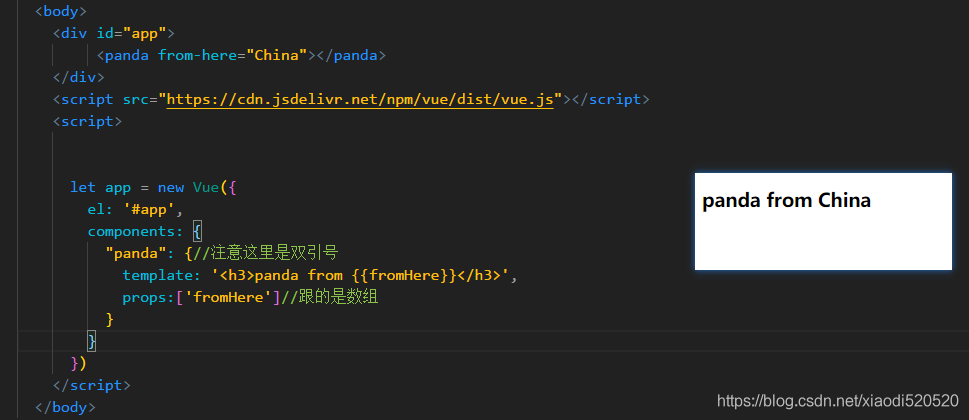 思路:使用v-bind和data数据绑定,将值传递到组件的模板里的插值里.