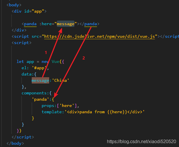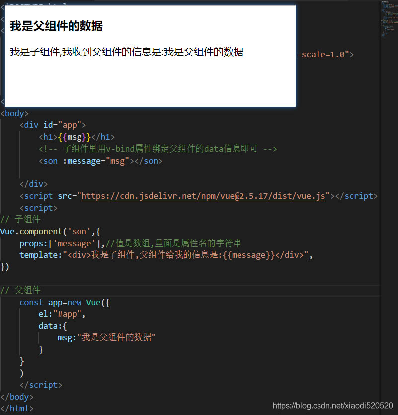 传递的过程总结:准备一个大的组件(在vue实例里)和一个子组件son,在son子组件里使用v-bind绑定要传递的message属性,message属性值是对应父组件里的data值,然后在son子组件component方法的第二个参数的对象里增加一个props属性(重点是这个props属性,它是用来接收父组件的值的),值是数组,里面就填字符串形式的message,最后直接在子组件的模板里用插值的方式使用这个message就可以了.