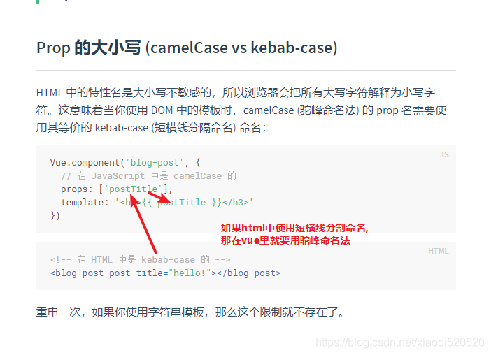 1.props的大小写:对于html里的短横线命名,在vue里面要用小驼峰命名法(大驼峰命名介绍:第一个字母也是大写);