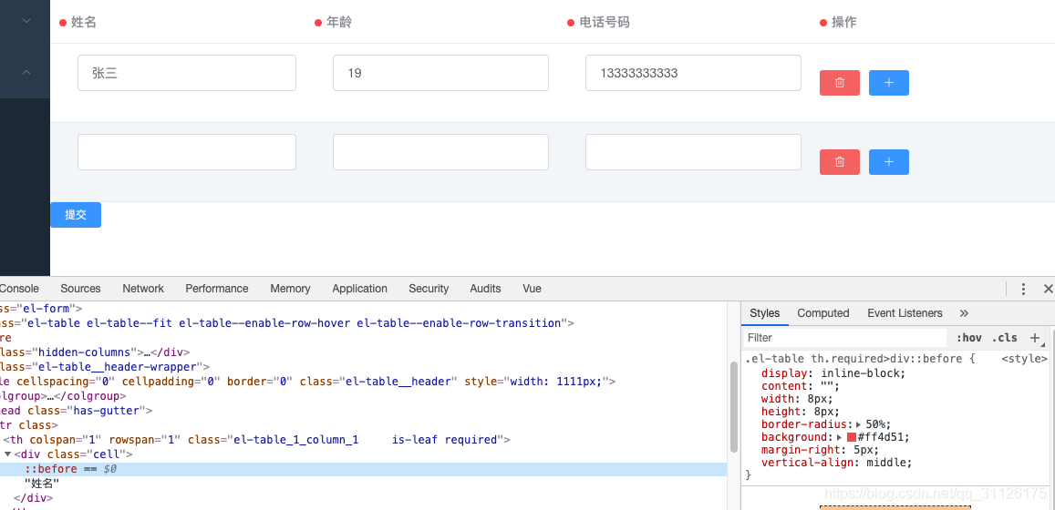 因为是在表格中,所以表单就不使用label了,所以这时必填选项的*没有了.