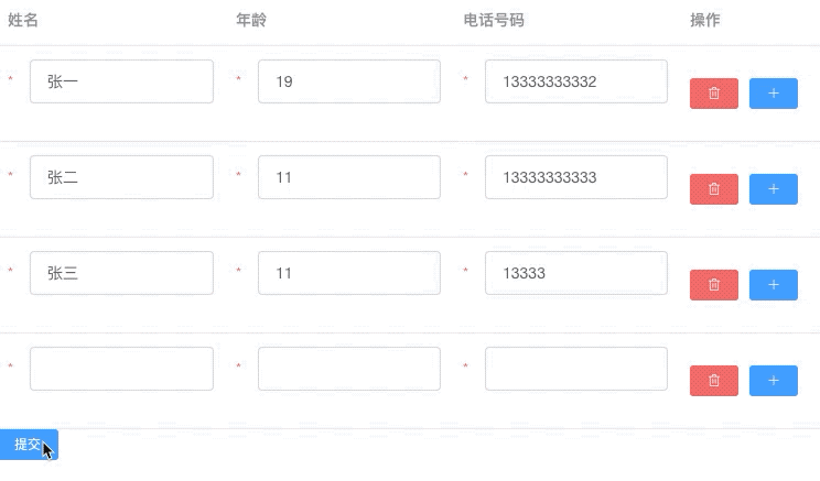 <el-form-item :prop=" 'tableData.'   scope.$index   '.name' " :rules="{ required: true, message: '名字不能为空', trigger: 'blur' }"> <el-table-column label="姓名">