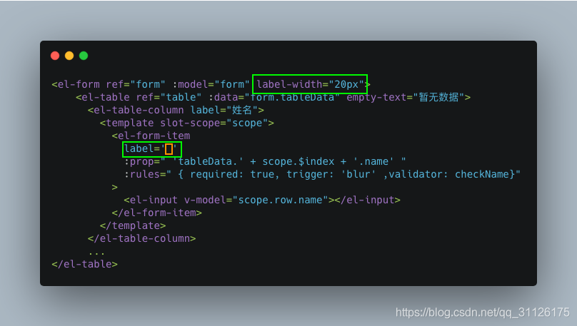 <el-form-item :prop=" 'tableData.'   scope.$index   '.name' " :rules=" { required: true, trigger: 'blur' ,validator: checkName}">