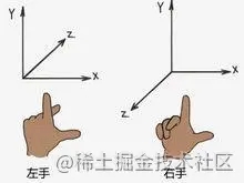 在threejs中,场景是右手坐标系, 把右手放在原点的位置,使大拇指,食指和中指互成直角,把大拇指指向x轴的正方向,食指指向y轴的正方向时,中指所指的方向就是z轴的正方向。