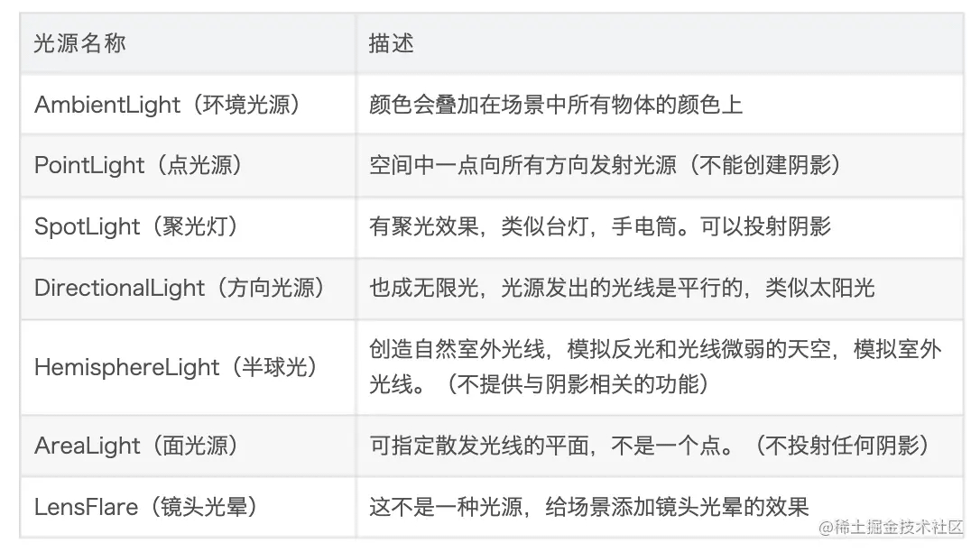 THREE.Light只是其他所有光源的基类,要让光源除了具有颜色的特性之外,我们需要其他光源。