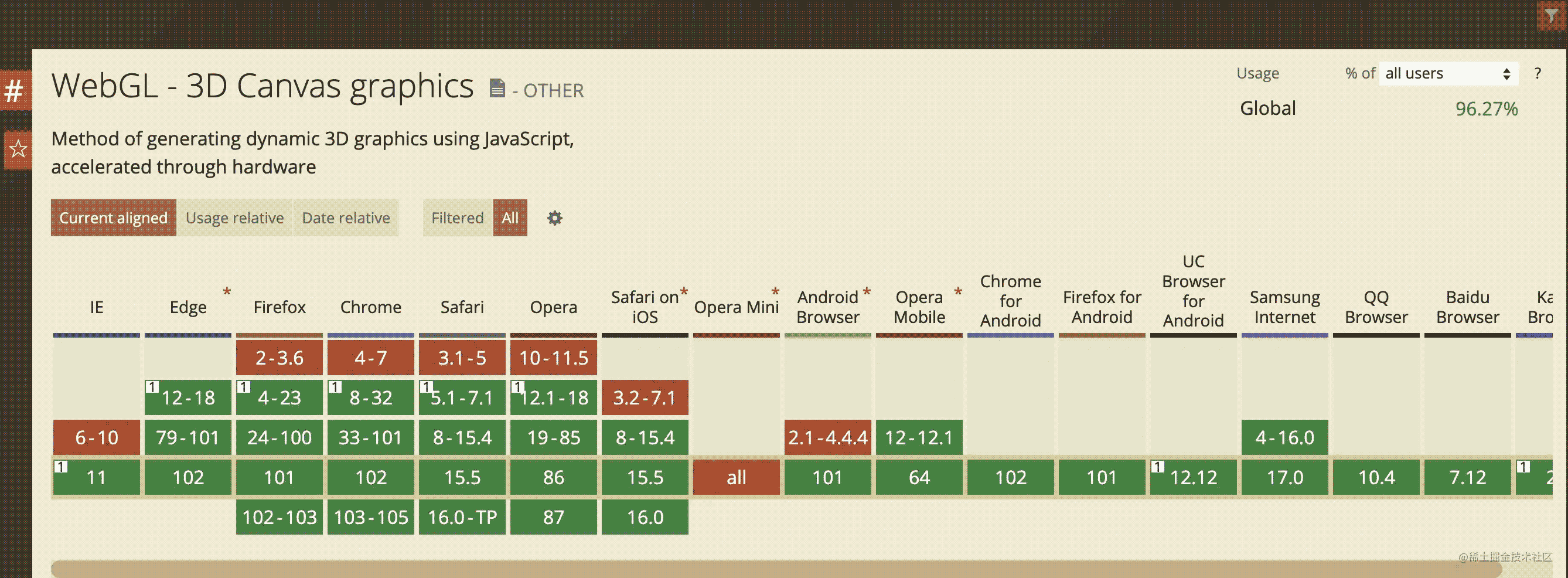 通过 can i use 查询可知,现在的主流浏览器都已支持webGL