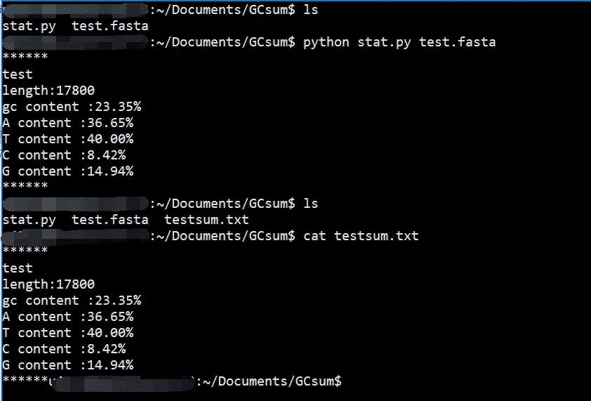 使用ls命令可以看到当前目录下有已经写好的py文件以及数据test.fasta。