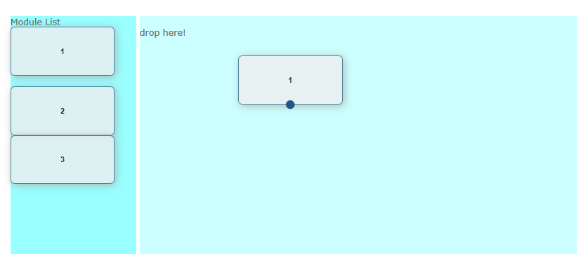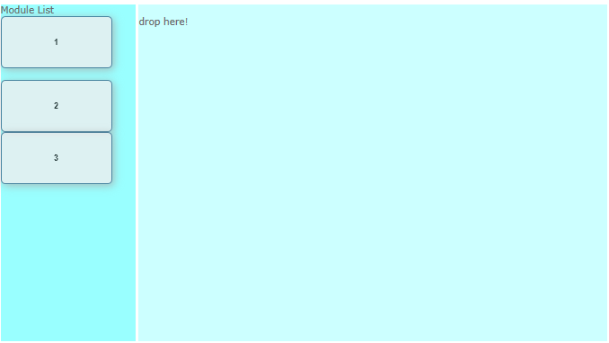 <div id="container"> <div id="mainContent"> <div id="sidebar"> Module List <div class="window" id=""> <strong>1</strong><br /> <br /> </div> <br /> <div class="window" id=""> <strong>2</strong><br /> <br /> </div> <div class="window" id=""> <strong>3</strong><br /> <br /> </div> </div> <div id="content"> <p>drop here!</p> </div> </div> </div