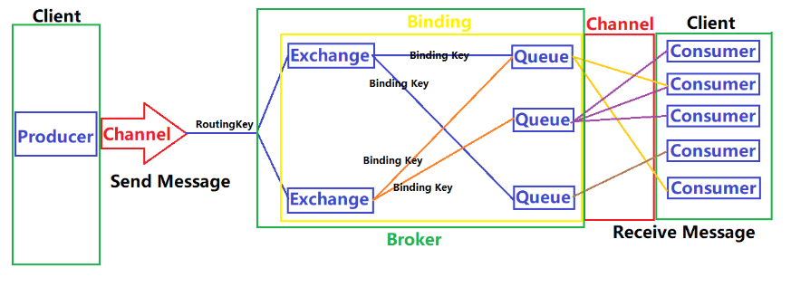 - 中间即是 RabbitMQ,其中包括了 交换机 和 队列。