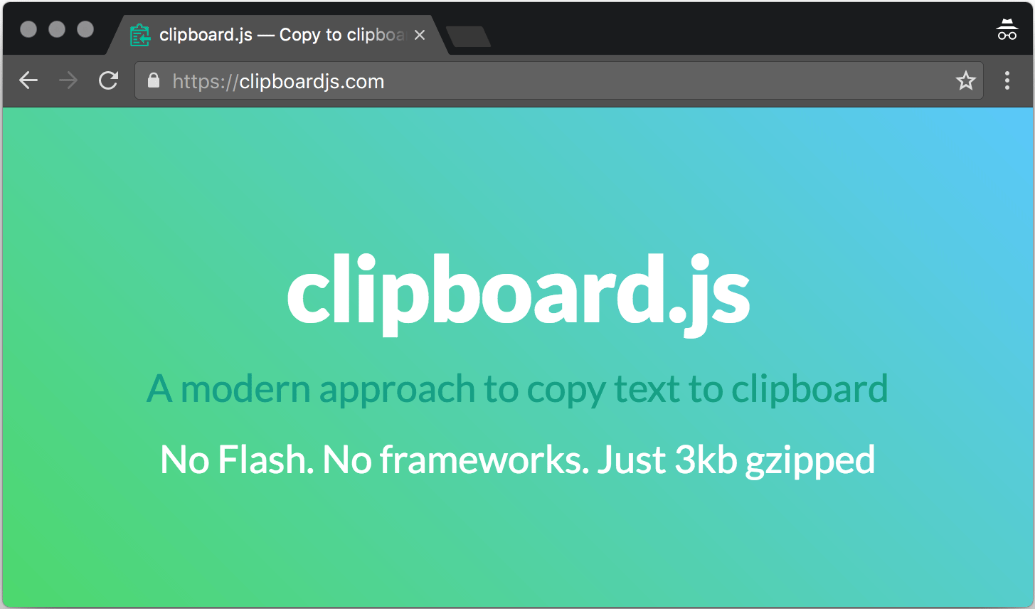 复制文字到剪切板不应该很难去实现。它不需要配置几十个步骤或者加载几百 KB 的文件。最重要的是,它不应该依赖 Flash 或其他臃肿的框架。