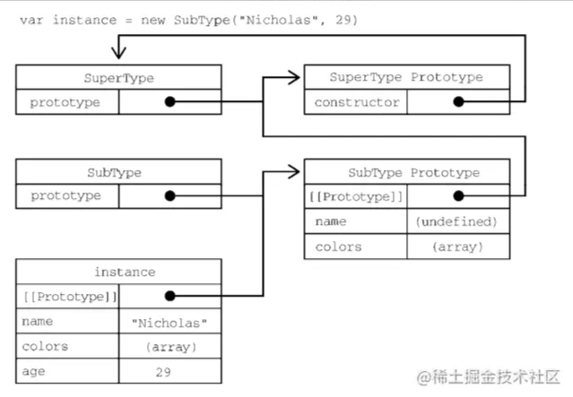 console.log(instance1);在上面的代码执行后, SubType.prototype上会有两个属性: name 和 colors 。它们都是 SuperType 的实例属性,但现在成为了 SubType 的原型属性。在调用 SubType构造函数时,也会调用SuperType 构造函数,这一次会在新对象上创建实例属性 name 和 colors 。这两个实例属性会遮蔽原型上同名的属性。