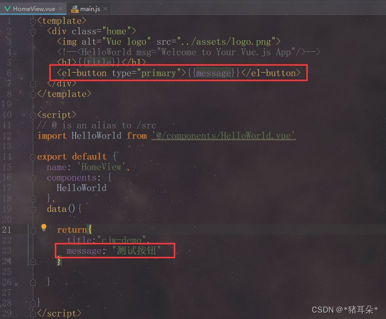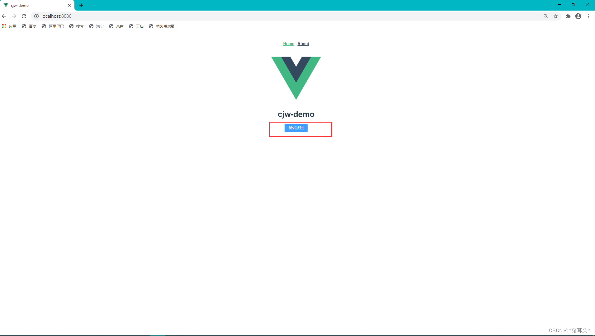 }).$mount('#app');在Home.vue中添加一个按钮进行测试: