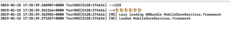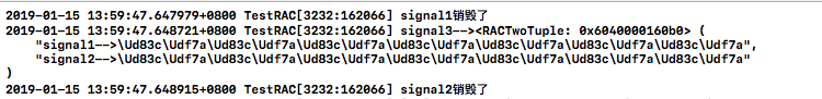 //通过定值创建RACTuple RACTuple *tuple = [RACTuple tupleWithObjects:@"1", @"2", @"3", nil]; //利用 RAC 宏快速封装 RACTuple *tuple2 = RACTuplePack(@"1", @"2", @"3"); //从别的数组中获取内容 RACTuple *tuple3 = [RACTuple tupleWithObjectsFromArray:@[@"1", @"2", @"3"]]; NSLog(@"元组-->%@", tuple3[0]); NSLog(@"第一个元素-->%@", [tuple3 first]); NSLog(@"最后一个元素-->%@", [tuple3 last]);