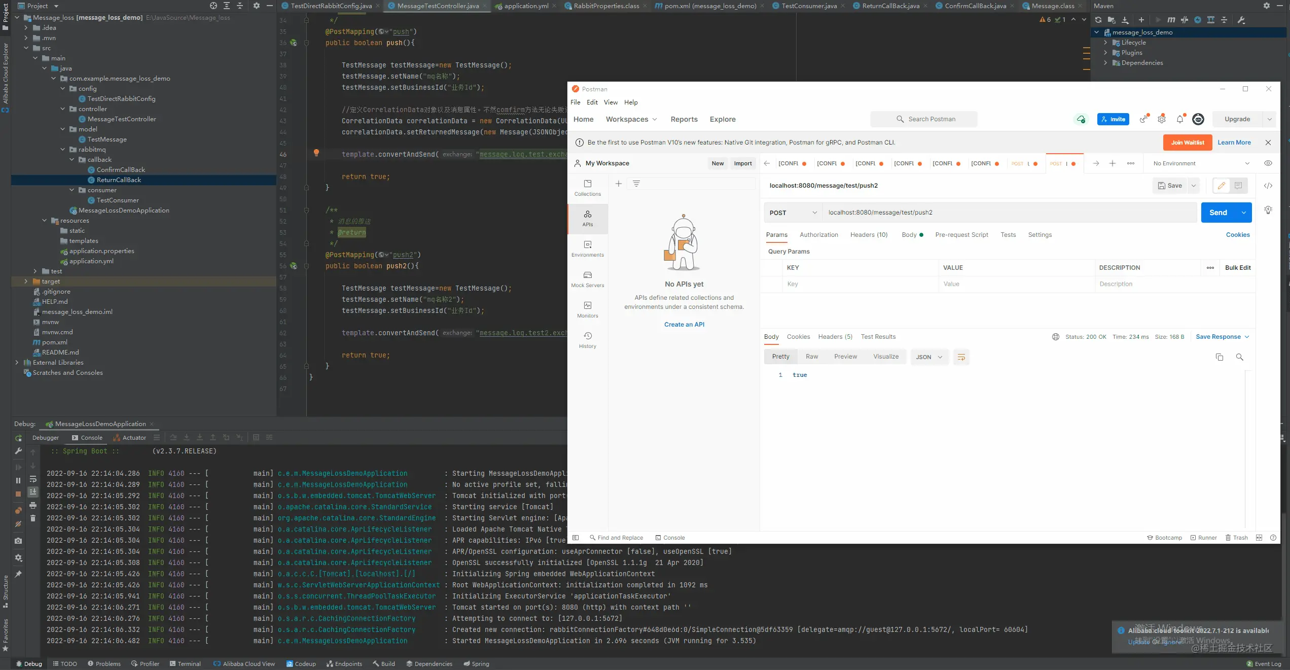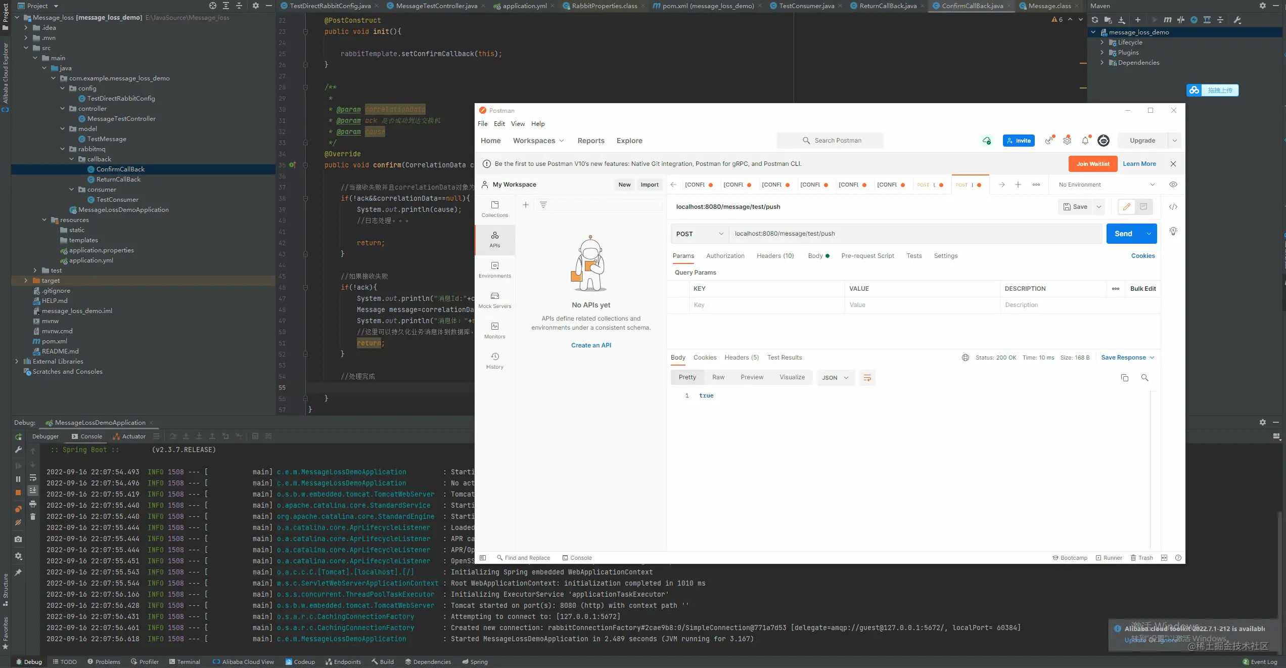 //发送消息(这里发送给了message.log.test.exchange11交换机,但实际rabbitmq并不存在)template.convertAndSend("message.log.test.exchange11","message_loss_test",testMessage,correlationData);