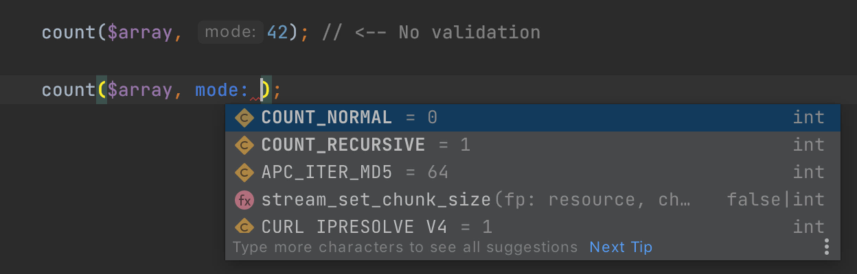 这与expectedArguments()函数可以执行的操作类似.phpstorm.meta.php,不同之处在于meta版本更像是完成对手。相反,该属性假定参数或返回值没有其他可能的值。