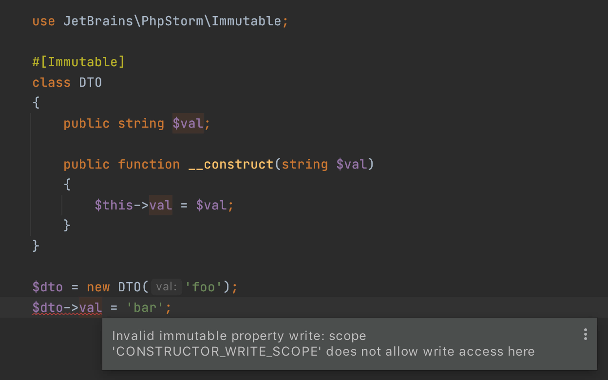 可以使用getter和setter或魔术方法在某种程度上模拟不可变的对象。从PhpStorm 2020.3开始,您可以简单地用#[Immutable]属性标记对象或属性。