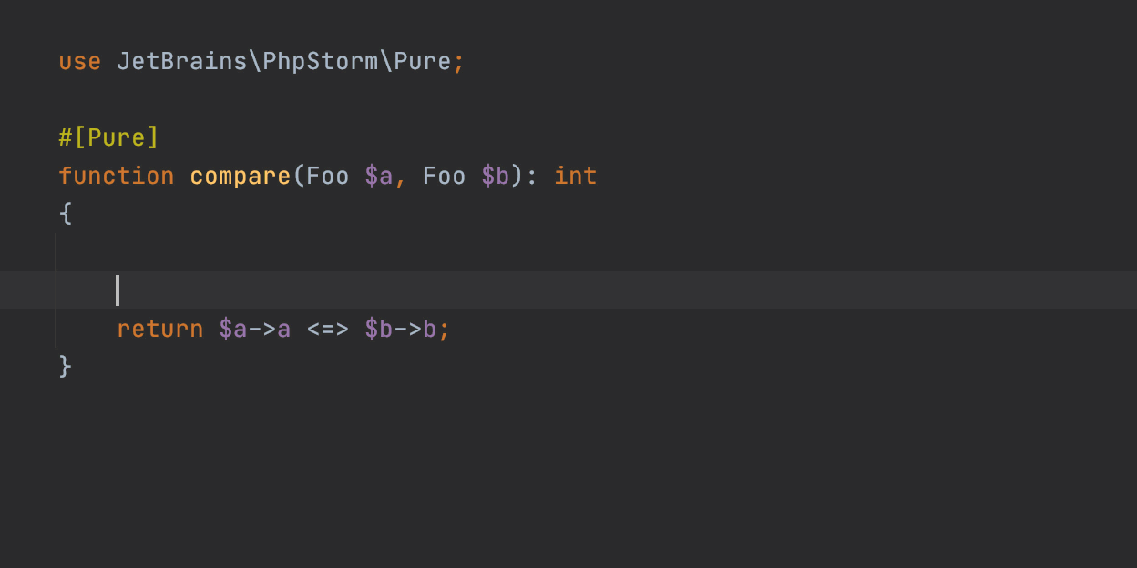 在PhpStorm 2020.3中,一些属性将在\JetBrains\PhpStorm\命名空间下可用。#[ExpectedValues]和#[NoReturn]是.phpstorm.meta.php函数的高级后裔。而#[ArrayShape]是PHPDoc的数组描述的一个备受期待的进化。此外,还会有#[Deprecated]、#[Pure]和#[Immutable]。