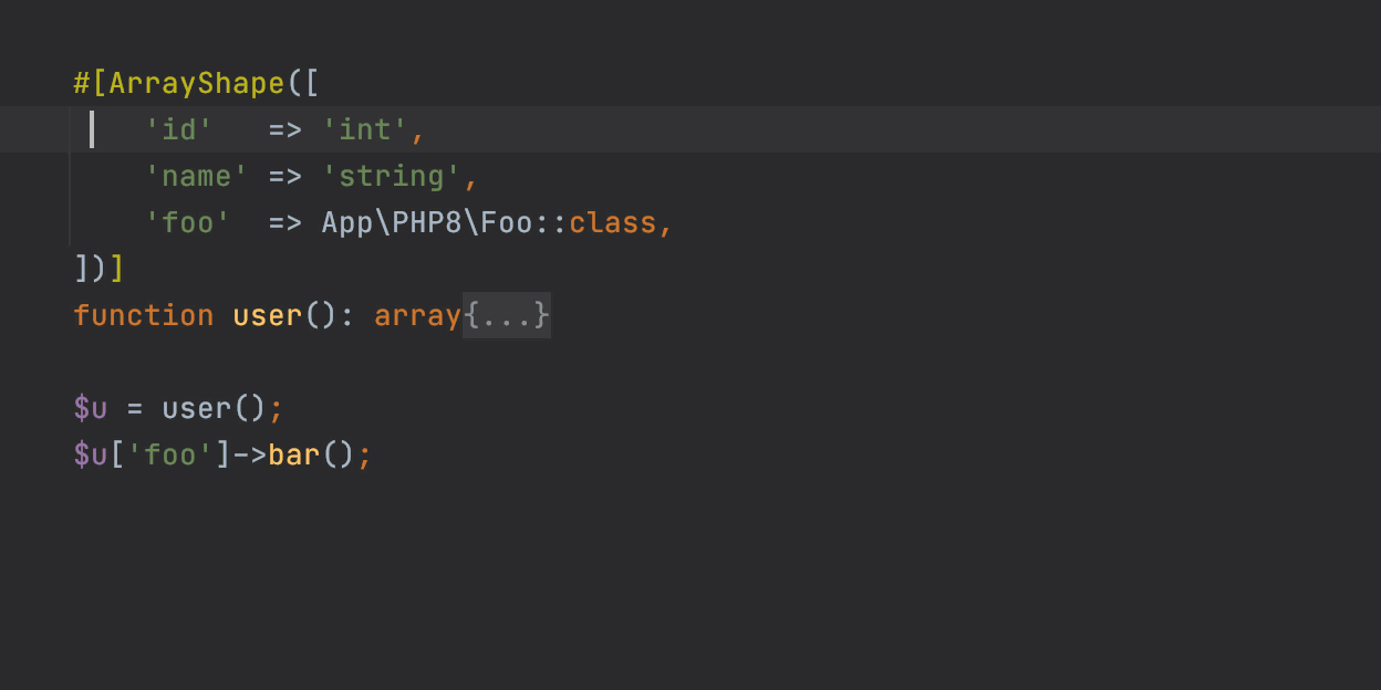 #[ArrayShape([ // ‘key' => 'type', ‘key1' => ‘int', ‘key2' => ‘string', ‘key3' => ‘Foo', ‘key3' => App\PHP 8\Foo::class, ])] function functionName(...): array