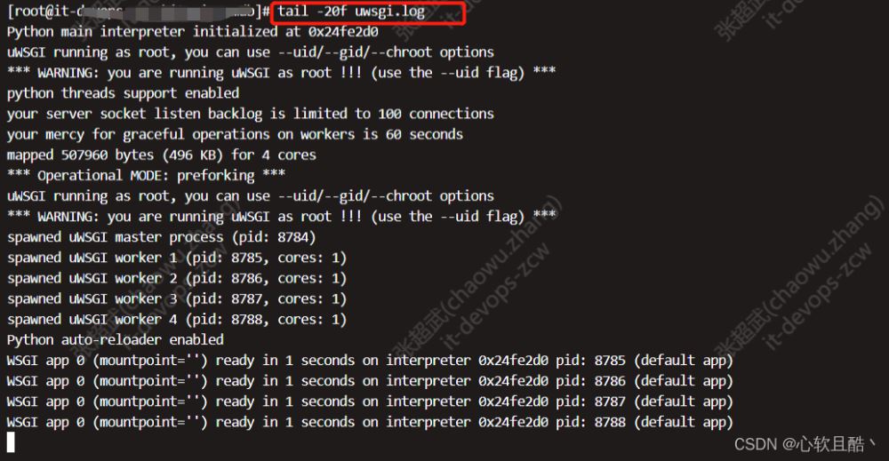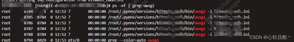 ## 在当前目录启动 uwsgi -i 项目名称.ini ## 启动之后查看进程 ps -ef | grep uwsgi