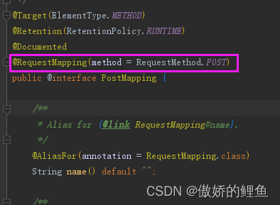 简单解释就是@PostMapping,@GetMapping等注解是@RequestMapping的派生注解。我们随便点开@PostMapping方法可以看到,这个注解上边被打上了@RequestMapping注解。派生注解是spring框架中的一个概念,与java本身无关,这里我们不去探究其原理(主要是我也不会),只知道@PostMapping与@RequestMapping实际上是有关联的就可以了。这个地方为了好理解也可以简单的认为@RequestMapping相当于是@PostMapping的父注解.