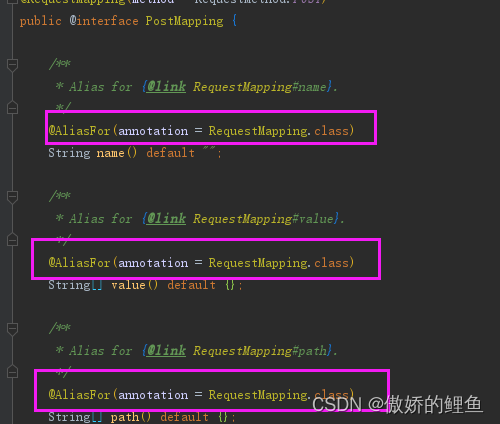 另外AnnotatedElementUtils.findMergedAnnotation()还对@AliasFor注解做了处理,简单说就是你的方法上打上了@PostMapping("add"),但是你拿到的父注解@RequestMapping中是没有“add”这个值的,@PostMapping的源码中通过@AliasFor注解指定了映射关系(如下图),