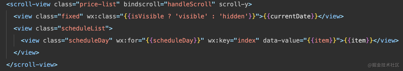 - class为fixed的元素在这做固定定位在scroll-view容器的顶部用于显示当前滑动到的日期