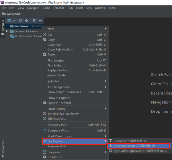 右键点击项目,选择Deployment > Download from ...进行下载。
