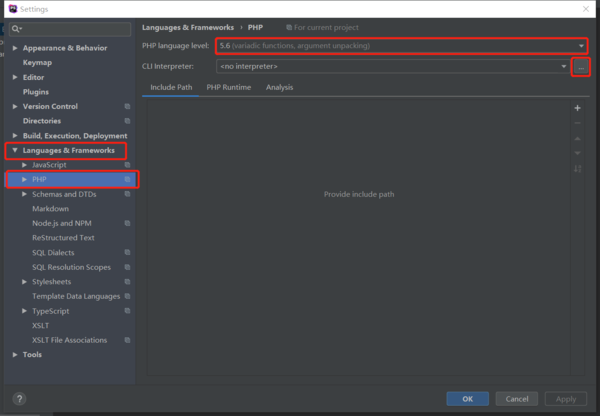 点击界面左上角的file选择Settings进入设置配置页,进入Language & Frameworks > PHP项,点击图中的···