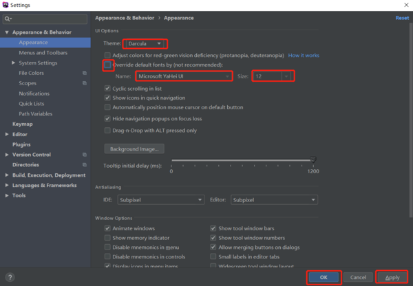 点击界面左上角的file选择Settings进入设置配置页,进入`Apparence& Behavior > Apparence项,可以选择主题Theme**强力建议选择 Darcula,暗色背景不伤眼睛**,需要勾选Override default fonts by`才能修改界面的字体。