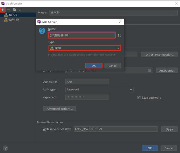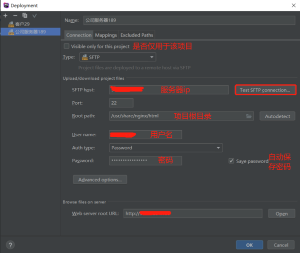 服务器连接配置,分别填写服务器的IP、端口号、项目根目录、用户名、密码,点击Test SFTP connection进行测试连接服务器。