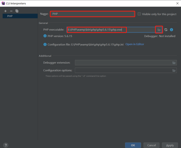 设置本地环境的名称,点击文件夹图标选择PHP的安装位置,即php.exe的目录,如果没有装过PHP的可以先安装个WAMP,这里就不做介绍了。