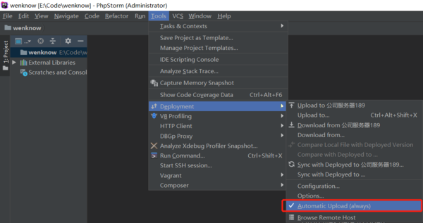 点击上方菜单Tools > Deployment > Automatic Upload(always)进行选中,即可在保存文件时自动上传到服务器。